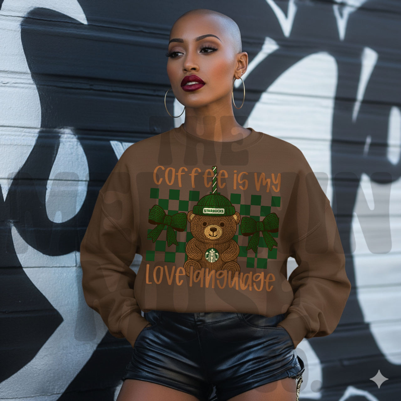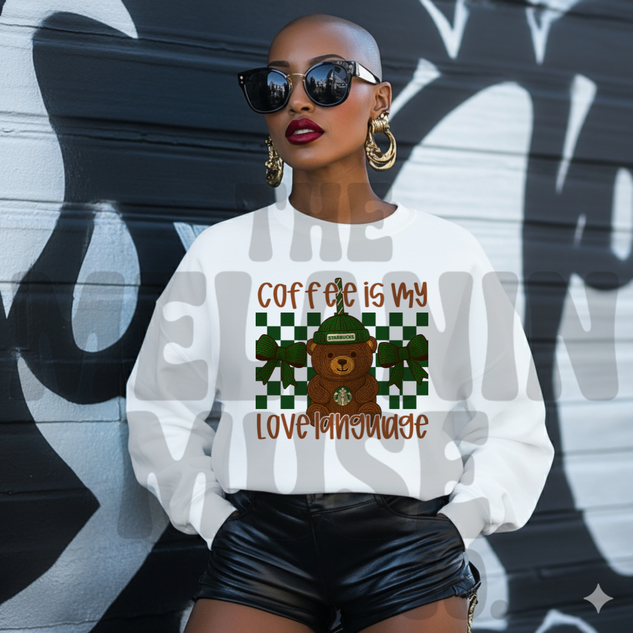 Express your true love language with this cozy and adorable "Coffee is My Love Language" sweatshirt! Featuring a charming coffee-themed bear mascot and a trendy checkered background, it's the perfect way to stay warm and stylish while celebrating your favorite beverage.