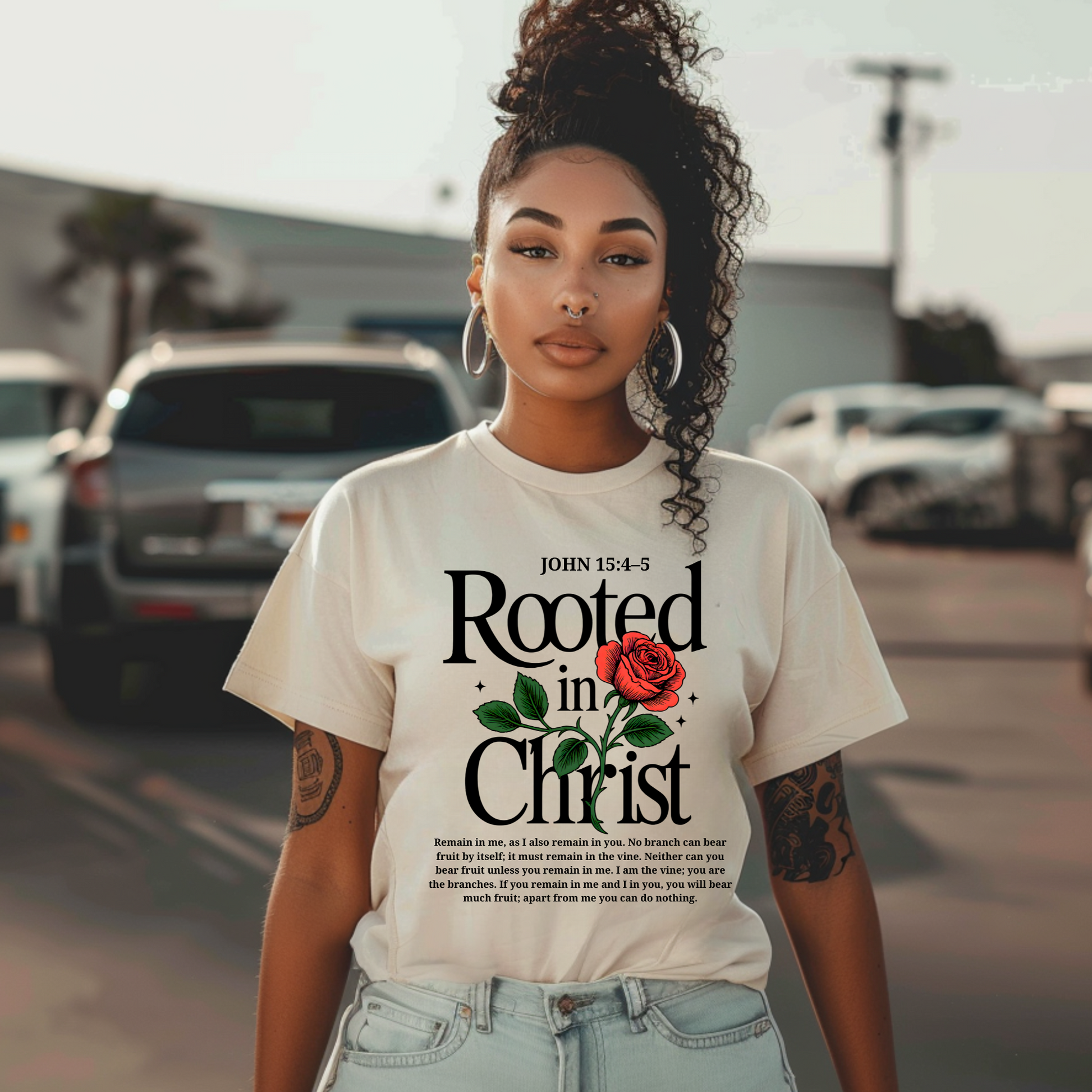 The Rooted in Christ Tee (John 15:4–5) is for the one who abides. Inspired by Jesus’ words, “Remain in me, as I also remain in you. No branch can bear fruit by itself…” this tee speaks to the power of connection and surrender to God’s presence.